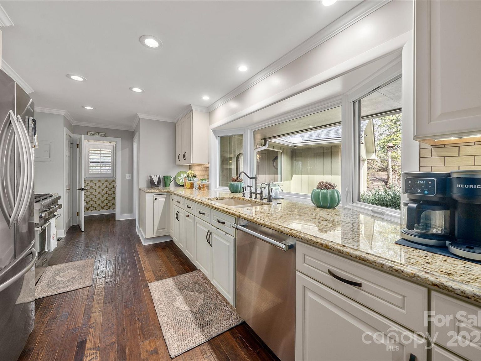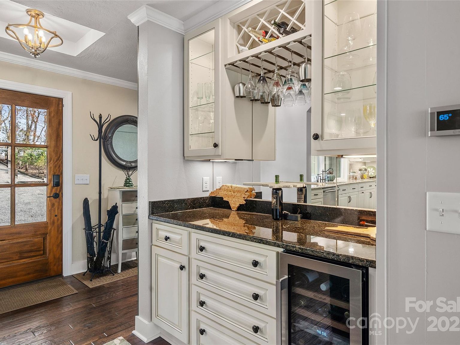 Discover this thoughtfully renovated 3,584 square foot ranch-style home in the charming foothills town of Tryon. The welcoming living room sets the tone with its elegant crown molding, hardwood floors, and fireplace. Large windows flood the space with natural light, while the exposed brick wall and neutral colors add architectural interest. Located just 45 minutes from both Asheville and Greenville, this home offers the perfect balance of peaceful mountain living and accessibility.